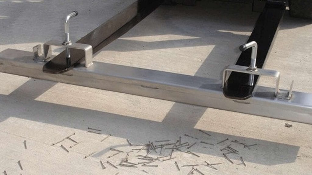 Fork mounted magnets are simple, but effective, method of clearing factory floors, car parks and goods yards of unwanted steel debris that could otherwise present a hazard to pneumatic tyres and operatives alike.
