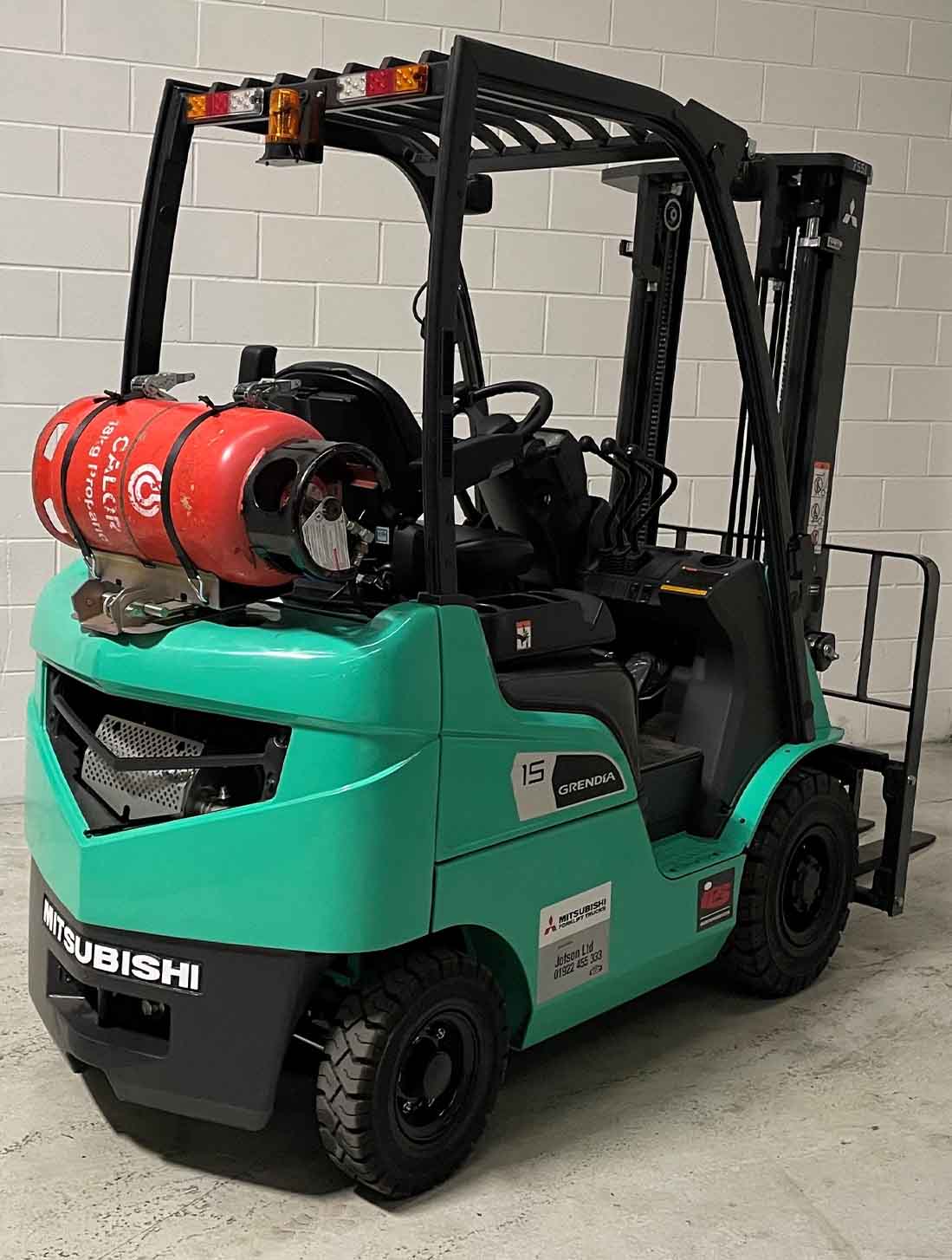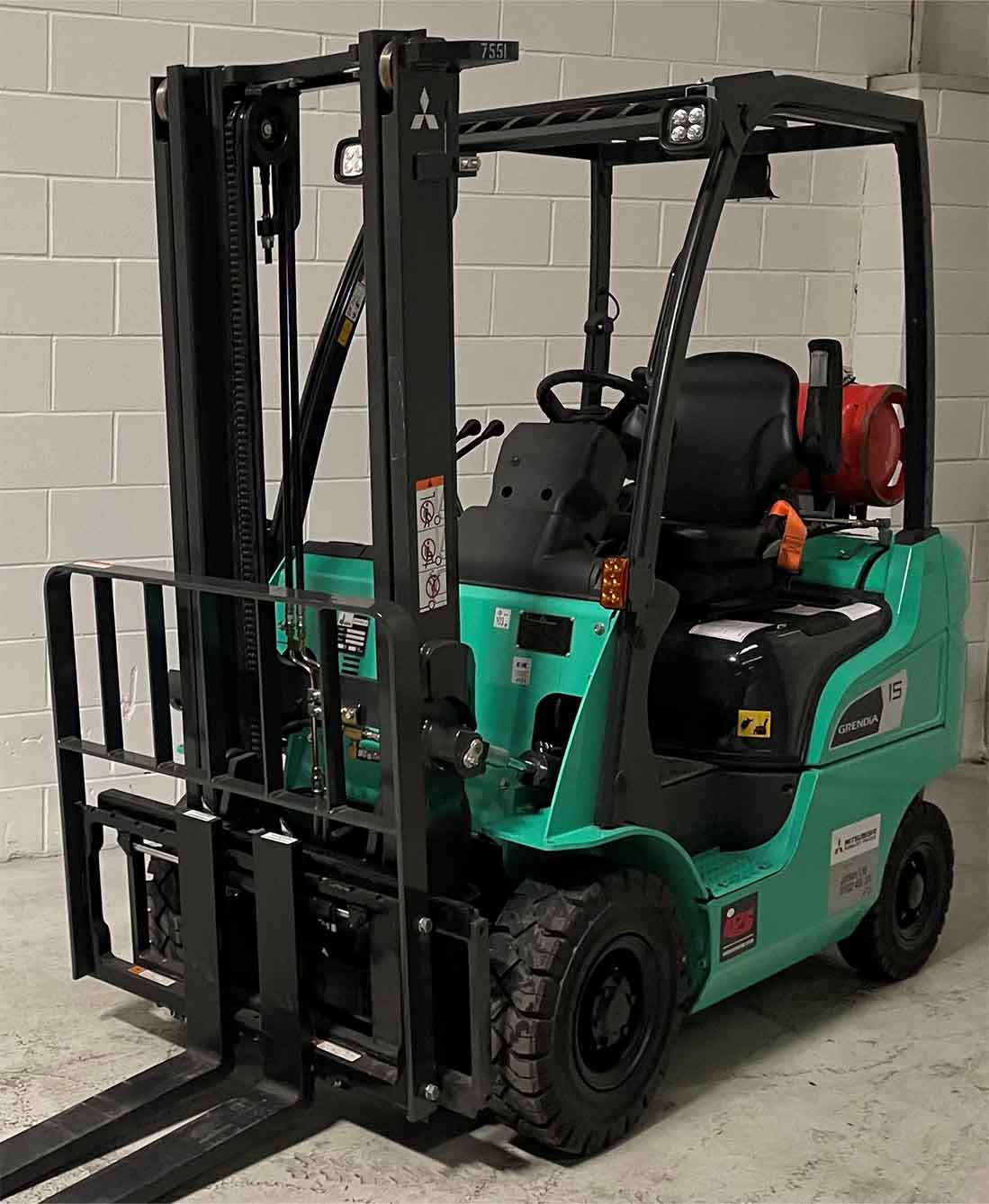 The 2021 Mitsubishi GP15N is a 1.5-tonne LPG-powered forklift designed for efficient indoor and outdoor material handling. It features a 3,300 mm simplex mast with a closed height of 2,140 mm, offering a lift capacity of 1,500 kg at a 500 mm load centre. The forklift is equipped with a sideshift, 1,100 mm forks, and a comprehensive safety package including forward and back lights, beacon, reverse alarm, and backup horn handle.